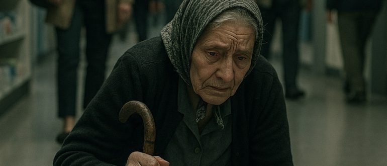 Een grootmoeder viel midden in de winkel. Iedereen keek gewoon toe, en alleen één meisje stopte om te helpen.