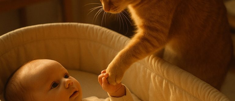 Mama werd wakker van hard miauwen. De kat stond bij de wieg en deed iets waardoor je haar overeind gaat staan.