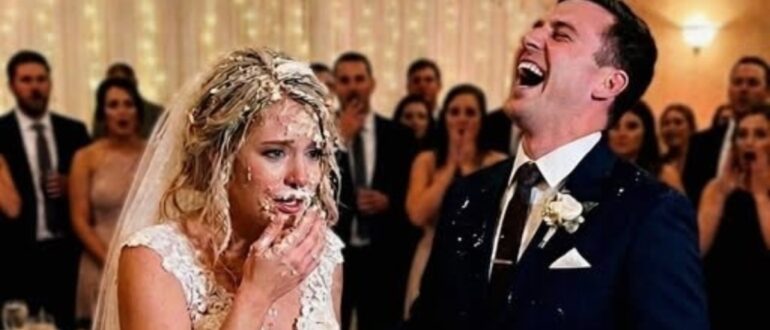 Mijn bruidegom duwde voor de grap mijn gezicht in de bruidstaart toen we hem aansneden – ik stond op het punt te huilen, toen mijn broer iedereen shockeerde.