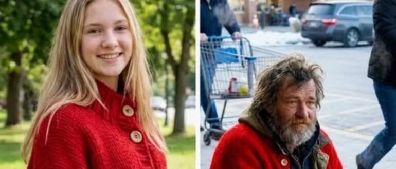 Ik zag een dakloze voor de supermarkt die de handgebreide rode trui van mijn vermiste dochter droeg – zijn vier woorden tellende bekentenis liet me mijn boodschappen van schrik laten vallen.