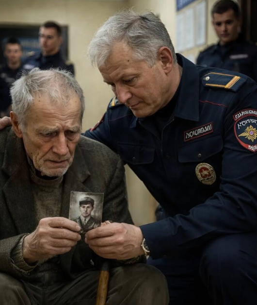 “Dat is mijn zoon,” fluisterde de oude man met een zwakke stem. De hoofdcommissaris knielde, zichtbaar ontroerd, voor de oude man midden op de gang. “Uw zoon heeft ons toen gered. Hij legde zijn lichaam over een granaat, zodat wij anderen konden leven. Tien mannen danken hem hun leven, en ik ben er één van,” sprak hij met trillende stem. Over het hele bureau viel een grafstilte, en de jonge agenten die nog een moment geleden lachten, lieten beschaamd hun blikken naar de grond zakken.