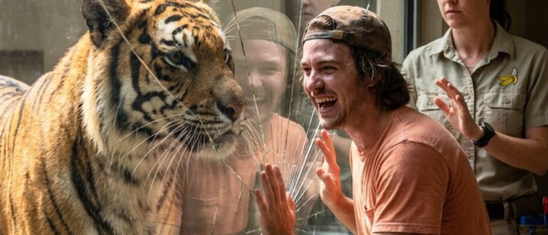 De dunne grens tussen roofdier en prooi valt weg wanneer een spottende bezoeker ontdekt dat glas het enige is dat zijn spiegelbeeld nog scheidt van het worden van een herinnering