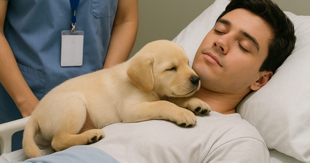De pup stapte langzaam naar binnen, de oren plat, ogen — als die van een mens, vol pijn en hoop. Hij liep rond het bed, snuffelde in de lucht, alsof hij controleerde: is dit echt hij?