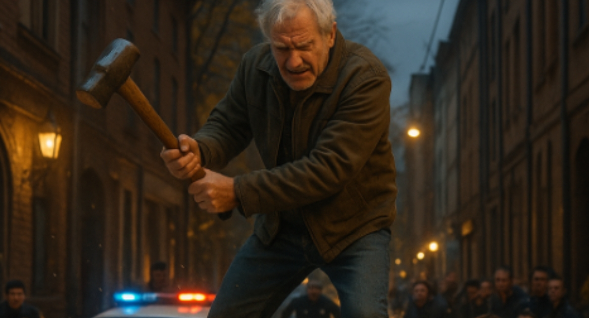 Op het dak van een witte bestelwagen stond een oudere man. In beide handen hield hij een zware voorhamer en bij elke slag veranderde hij de auto in een hoop verbogen metaal. Het metaal gonsde, het dak kraakte, het glas stortte neer, en met elke slag ontsnapte er een ingehouden kreet uit zijn borst — een mengeling van pijn, wanhoop en waanzin.