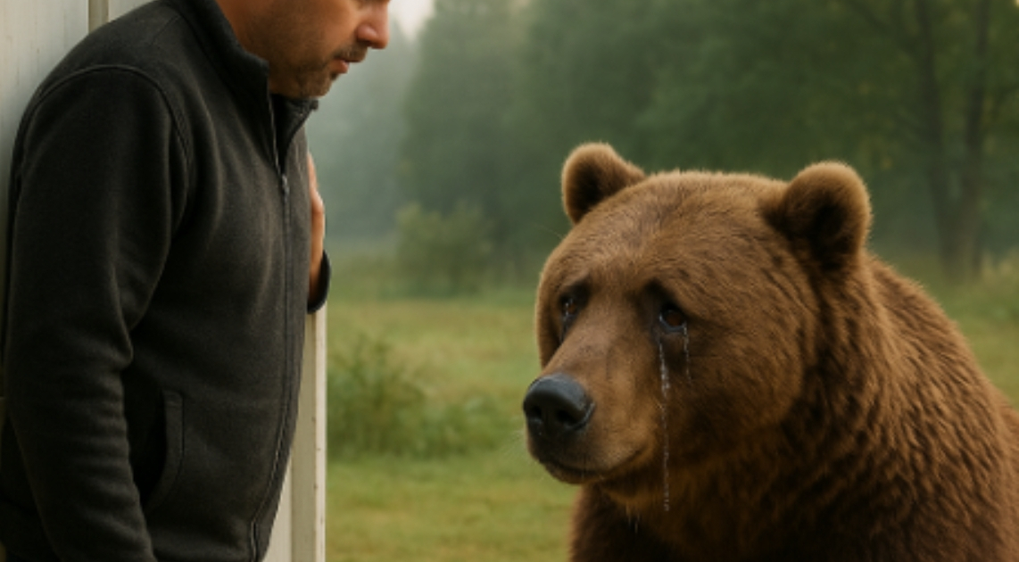 Het was rond zes uur ’s ochtends. Ik opende de deur om de koele ochtendlucht binnen te laten en… verstijfde. Aan de rand van de tuin, precies bij de veranda, stond een berenmoeder. Groot, uitgeput, trillend. Haar ademhaling was zwaar, haar ogen vochtig alsof ze huilde. Dit was geen blik van een roofdier. Dit was de blik van een moeder die nergens heen kon.