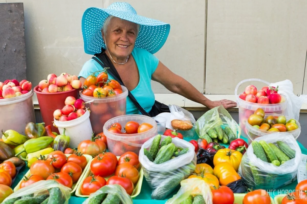 De vrouw, gekleed in een versleten trui en een verbleekte rok, had netjes tomaten, wortelen en komkommers uitgestald.