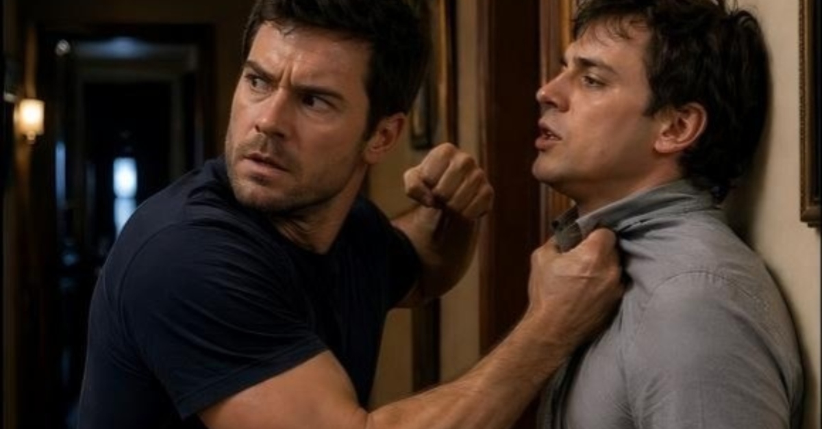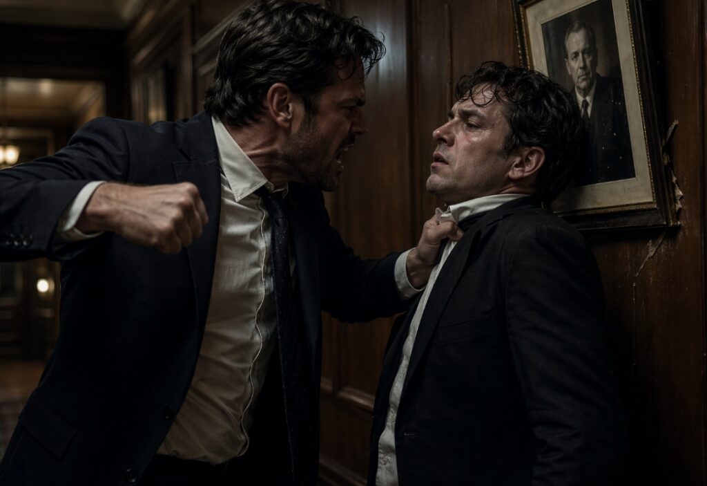 De houten wandbekleding van de gang kraakte onder het gewicht van de confrontatie, een geluid dat bijna werd overstemd door het zware, haperende ademhalen van twee mannen die hun hele leven om dezelfde lucht hadden gestreden. Elias had zijn broer Julian zo hard tegen de muur gedrukt dat een ingelijste foto van hun overleden vader tegen het pleisterwerk trilde. Zijn knokkels waren wit, zijn greep in Julians kraag zo strak dat de stof op barsten stond.