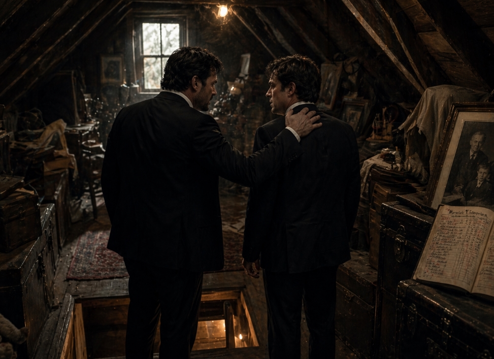 Julian zakte een paar centimeter langs de muur naar beneden en haalde trillerig adem, maar hij probeerde niet weg te komen. Hij wees enkel omhoog, naar het plafond—naar het luik dat al jaren niet meer was geopend, sinds hun moeder was overleden.