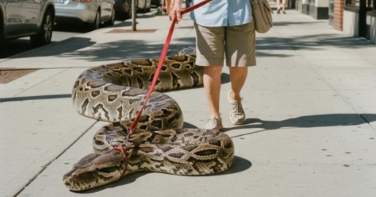 Midden op de dag werden voorbijgangers op een van de drukste straten van de stad geconfronteerd met een tafereel dat ze nooit meer zouden vergeten. Een 70-jarige gepensioneerde vrouw wandelde rustig over het trottoir met een riem in haar hand. Alleen zat er aan die riem geen hond of kat vast, maar een enorme python die zich traag en zwaar over het asfalt voortbewoog. Terwijl sommige mensen in paniek wegvluchtten, pakten anderen vol ongeloof hun telefoons om dit onwerkelijke moment vast te leggen.