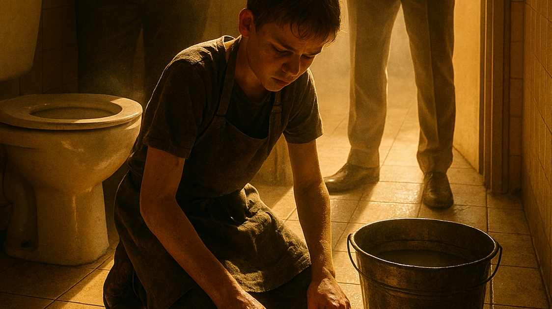 De twaalfjarige Alex knielde op de grond in het toilet, de spons uitwringend en schoonmaakmiddel in de vieze tegels wrijvend. Het water onder zijn handen was allang donker geworden, en zijn vingertoppen waren rood en brandden van de chemicaliën. Maar hij ging door. Stil, koppig, alsof hij iets aan zichzelf bewees.