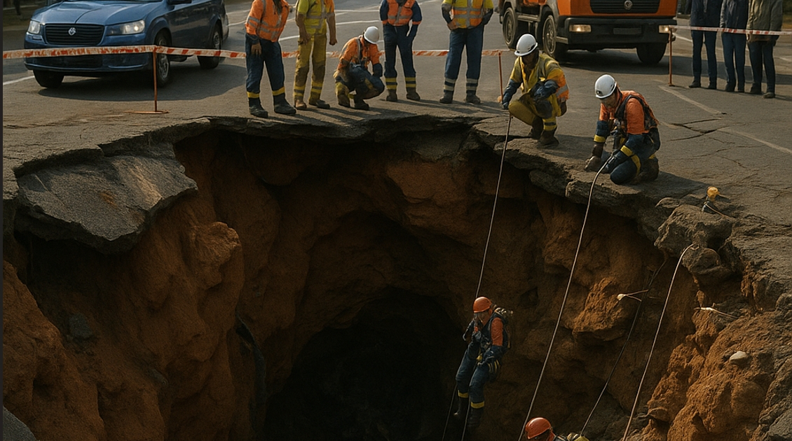 Binnen enkele minuten werd duidelijk: een deel van de weg was gewoon verdwenen. Het asfalt, waar elke ochtend bussen en auto’s reden en voetgangers langs liepen, was ingestort en had een enorme kloof gevormd.