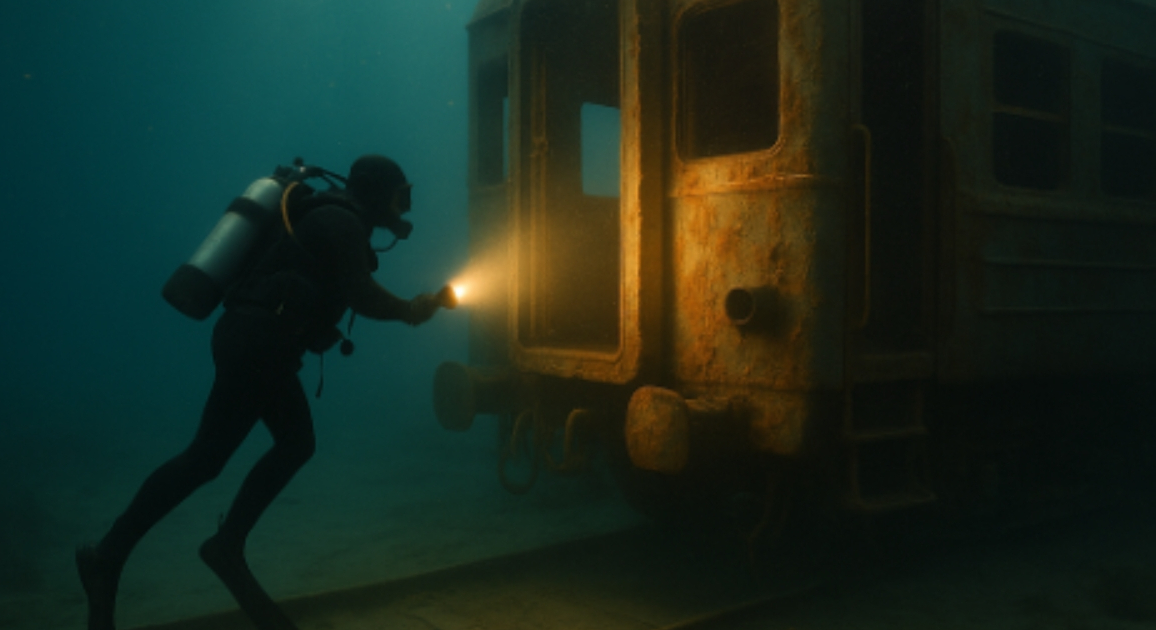 Op een diepte van meer dan twintig meter zag de duiker iets waardoor zijn adem stokte. In het zand, half bedekt met modder, stond een trein. Echt, roestig, omwikkeld met algen, alsof hij bevroren was in de eeuwigheid. Wagon na wagon, als een spookachtig caravan, strekte hij zich uit in de verte.