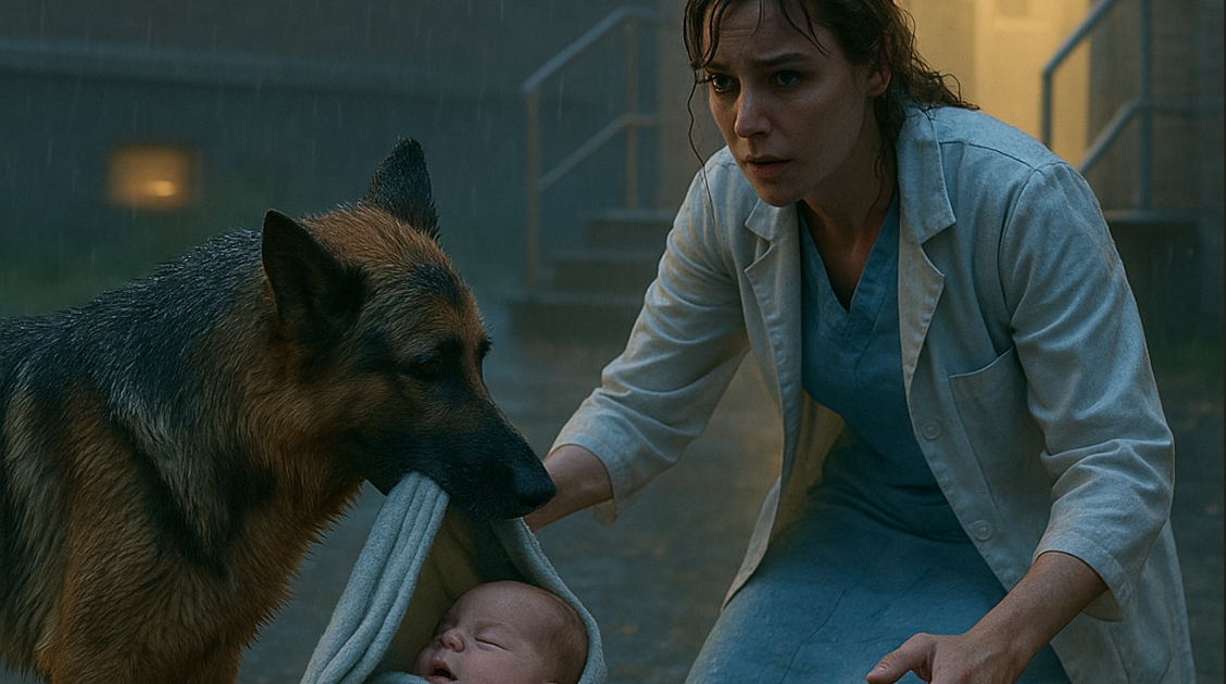Zo kwam Aida het ziekenhuis binnen — de Duitse herder die de baby had gebracht, alsof ze wist dat dit zijn enige kans was.