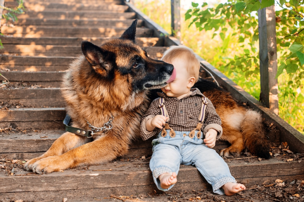 Een Duitse herder met een baby in een mandje.