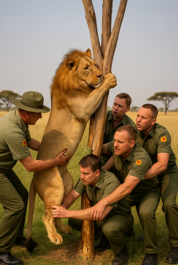 Een leeuw. Groot, trots roofdier — nu lag hij onder een boom, bijna bewegingsloos. Zijn manen waren verward, de ogen half gesloten, de adem nauwelijks voelbaar. Toen de rangers dichterbij kwamen, stokte hun adem: een dikke tak had zijn nek gevangen, als een strik. De huid was gescheurd, bloed opgedroogd. Het was duidelijk — hij had gevochten. Lang. En hij verloor.