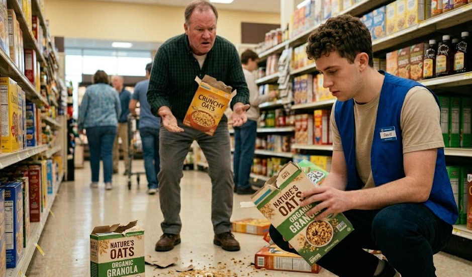 De supermarkt zoemde met de gebruikelijke namiddagdrukte, totdat het geluid van plastic dat op de linoleumvloer kletterde door de witte ruis heen sneed. Het was geen ongeluk of een onhandige misstap, maar het gevolg van een man die haast had—zijn bewegingen scherp en hoekig terwijl hij naar een doos ontbijtgranen op de bovenste plank reikte.