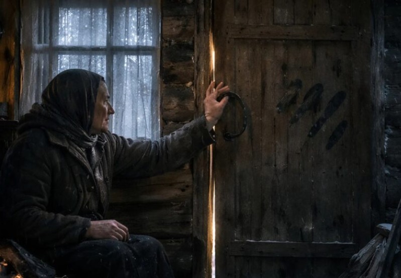 Aan de rand van het dorp, in haar oude en vervallen houten huis, leefde een oude vrouw helemaal alleen. Op een ijskoude winternacht opende ze haar deur voor vier vreemdelingen die plotseling verschenen. Met harde blikken, tatoeages en zware tassen in hun handen zeiden de mannen dat de wegen door de sneeuw waren afgesloten en dat ze enkel een plek zochten om te schuilen. Hoewel de vrouw zich ongemakkelijk voelde door hun dreigende uiterlijk en het grote bedrag aan geld in hun tassen, kon haar geweten het niet verdragen hen aan de dood over te laten. Ze deelde haar laatste stuk brood met hen.