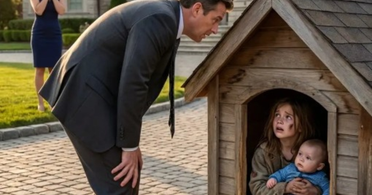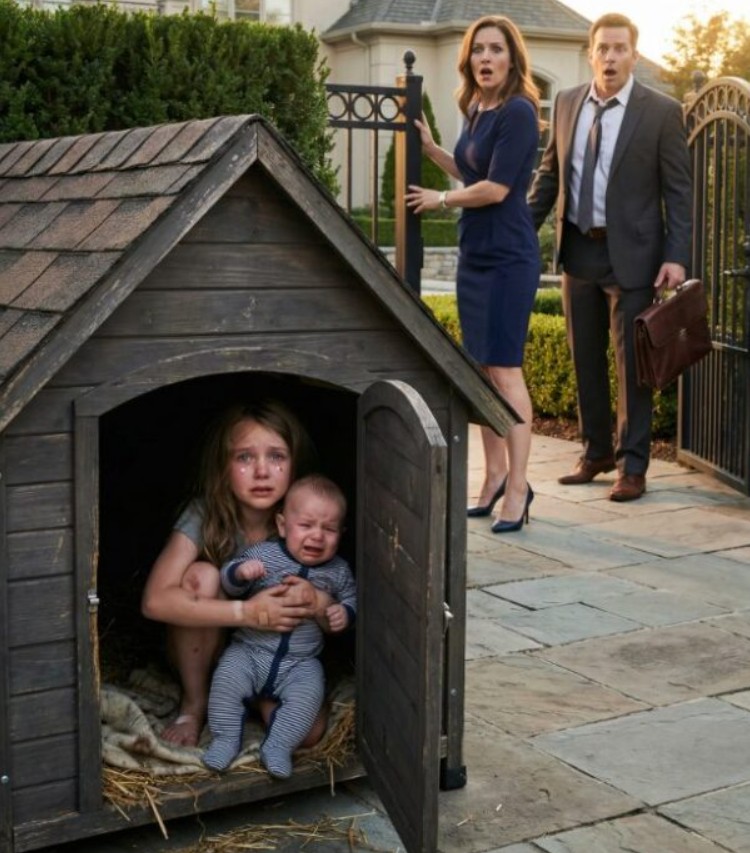 Toen de vrouw hen naar het hondenhok in de tuin sleurde, trilde het kleine meisje van angst. “Alsjeblieft, we hebben niets slechts gedaan,” fluisterde ze, maar de vrouw duwde hen kil en hardhandig in het kleine, donkere hok en sloot de deur. In het pikdonkere hok begonnen de kinderen te huilen; het meisje omhelsde haar tien maanden oude broertje om hem te troosten en zei: “Niet huilen, papa komt zo wel.” Twee uur lang zaten ze hulpeloos opgesloten in die krappe ruimte.