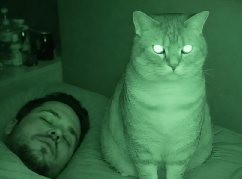 Alles was glashelder op de beelden: kort nadat wij in slaap vielen, sprong de kat uit bed en kwam naar ons toe. Maar het verrassende was dat haar doelwit niet ik was, maar mijn man. Ongeveer een uur lang bleef ze als een standbeeld onbeweeglijk naar zijn gezicht kijken. Toen begon het eigenlijke tafereel. Zodra mijn man begon te snurken, stak de kat rustig haar poot uit en legde die op zijn mond, en bleef daar totdat het snurken stopte. Zodra het stil werd, keerde ze trots terug naar haar plekje en viel vredig in slaap.