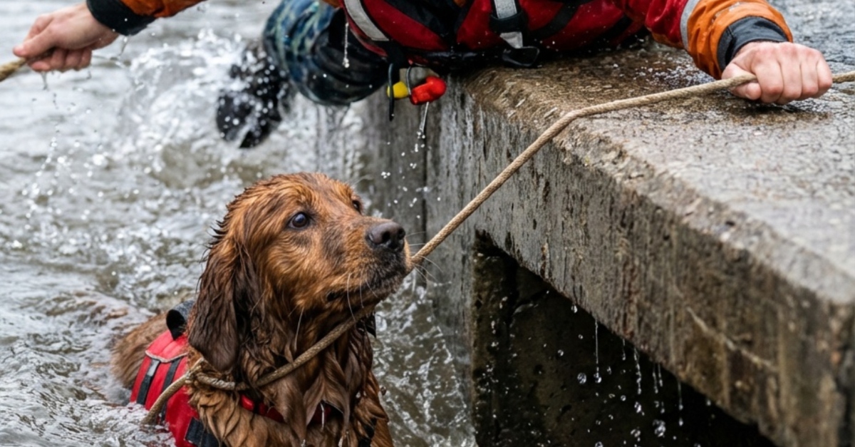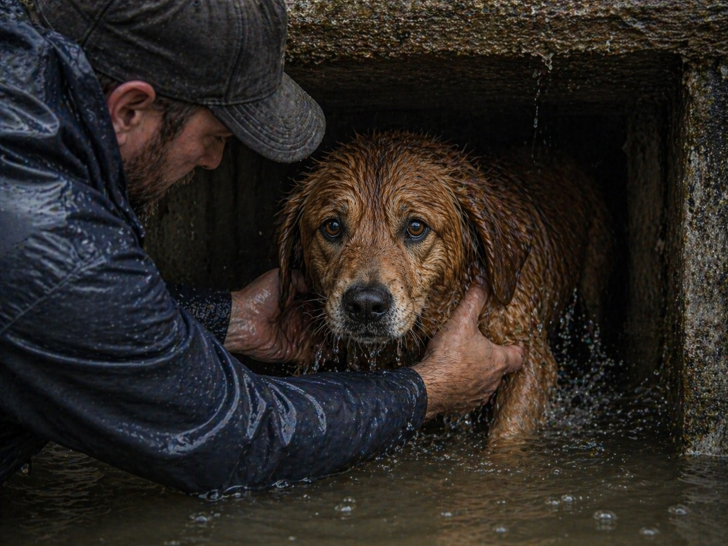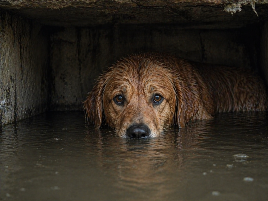 De middaglucht had zich gevuld met een paarsblauwe, gekneusde gloed, terwijl een stortregen neerdaalde die de lokale beek in een razende, kolkende watermassa veranderde. Tussen het opstuwende puin zat een kleine, doodsbange terriër vast op een splinterende houten kist. De riem van de hond was blijven haken aan de rand van de kist, terwijl het andere uiteinde verstrikt zat in het ijzeren rooster van een enorme overstortafvoer. Terwijl het water bleef stijgen, begon de kist richting de draaikolk te drijven, en de lijn werd met elke centimeter korter. Elke golf van de stroming trok het dier dichter naar de donkere, brullende monding van het afvoersysteem.