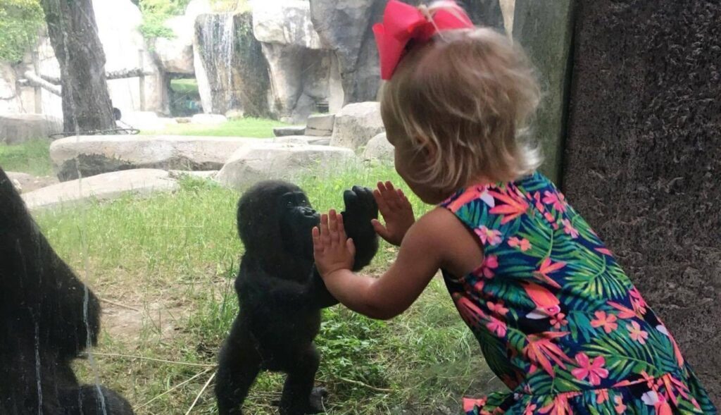 De gorillababy stak zijn kleine handje op en raakte het glas aan.