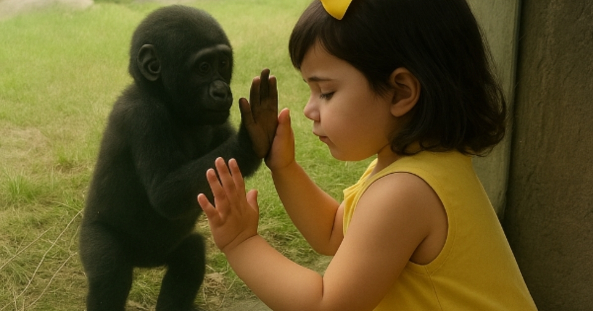 En een moment later verscheen de moedergorilla — groot, rustig. Ze liep naar de baby, omhelsde hem en duwde hem zacht terug naar het glas, alsof ze zei: