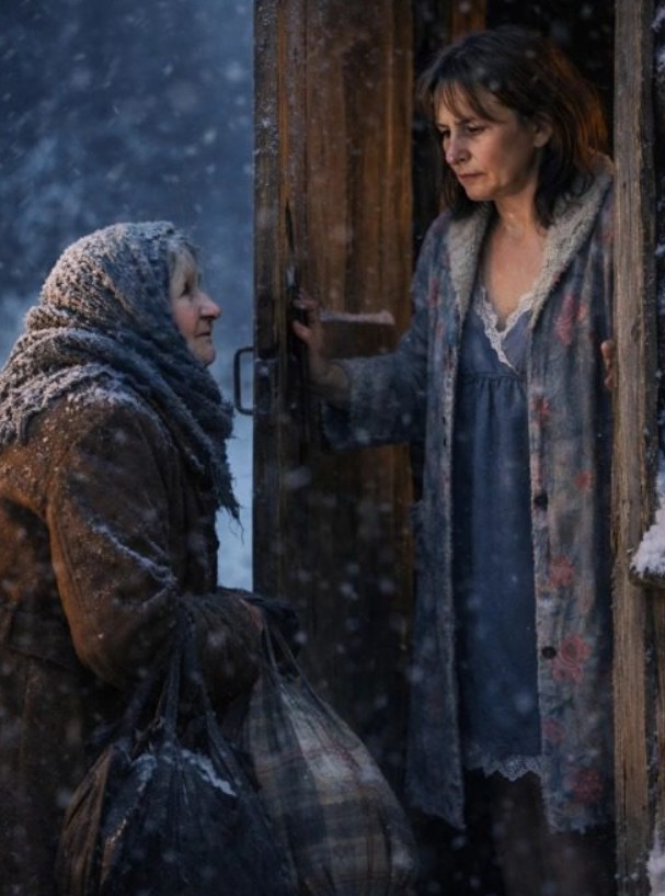 Mijn verstand schreeuwde dat ik de deur niet moest openen, maar de wanhopige trilling in haar stem raakte mijn geweten. Toen ik opendeed, stond daar een kleine, broze vrouw, bedekt met sneeuw, op het randje van bevriezing, steunend op haar stok en met een versleten, enorme tas in haar hand. Ik haalde haar snel naar binnen en zette haar bij de kachel. De laatste hap die we nog hadden — die ene snee brood — gaf ik haar. “Eet maar, tante, dit is alles wat we hebben,” zei ik zacht. Ze keek me lang aan en fluisterde: “God zal je dit vergelden.”