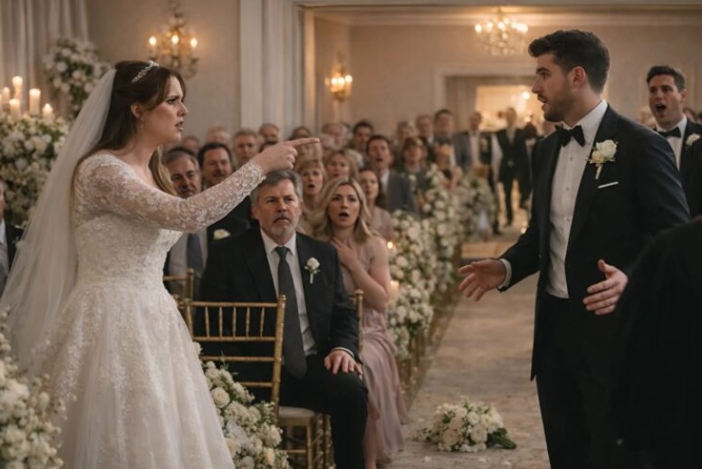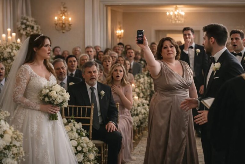 Toen de ceremonie begon, zaten alle gasten op hun plek en liep mijn dochter vol spanning richting het altaar. Precies op dat moment, in het stilste moment van de zaal, liep ik naar de technische tafel en verbond mijn telefoon met de luidsprekers. Enkele seconden later weerklonk Marks brutale stem door de hele zaal: “Ik trouw alleen met dat varken voor zijn geld…” Iedereen verstijfde; de blikken van de gasten waren gericht op de bruidegom, die rood aanliep van woede.