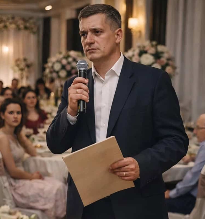 De bruid kon haar tranen niet tegenhouden en er viel een ongemakkelijke stilte in de zaal. Op dat moment stond haar vader rustig op. Het was een bescheiden ogende man in een eenvoudig pak. Zonder te schreeuwen of boos te worden nam hij de microfoon en gaf toe dat zij inderdaad van het platteland kwamen. Maar wat hij daarna zei, liet iedereen sprakeloos achter — vooral de arrogante schoonmoeder.