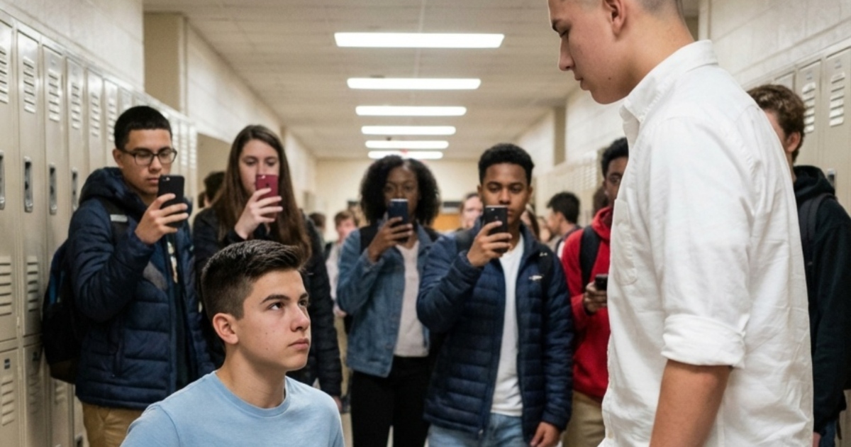 Het gelach in de gang veranderde in doodse stilte. De telefoons filmden nog steeds, maar nu legden ze niet langer de vernedering van een kwetsbare jongen vast, maar de val van de zogenaamd onaantastbare pestkoppen. Emma wierp een scherpe blik op hen en op de omstanders en zei: “Jullie verwijderen die video’s nu meteen. En als iemand hem ooit nog aanraakt, krijgen jullie met mij te maken.” Niemand durfde haar tegen te spreken.