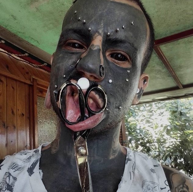 Op slechts 27-jarige leeftijd ziet Niccolò Saverino uit Aprilia, Italië, er helemaal anders uit dan wie dan ook — en precies zo wil hij het ook. In een periode van tien jaar heeft hij zijn lichaam omgevormd tot een levend canvas. Bijna 70% van zijn huid is bedekt met tatoeages, zijn tong is in tweeën gespleten, en kleine subdermale implantaten steken onder zijn huid omhoog als hoorns. Zijn oren en gezicht zijn versierd met piercings en tunnels, elk onderdeel van de kunst die hij elke dag met zich meedraagt.